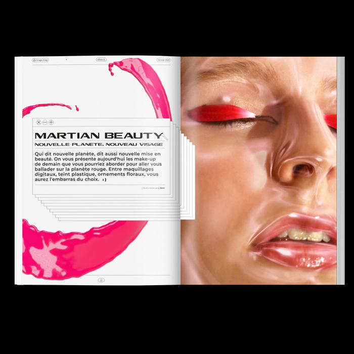 Avant de vous évader pour Mars, lisez le magazine fictif Mirage. Entre rêves, virtualité et réalité, Mirage s’intéresse à la conquête spatiale, à la mode de demain, aux réseaux sociaux, au progrès technologique et au mouvement du transhumanisme. Ce magazine vous transportera dans son univers onirique et futuriste avec des images 3D, des photographies personnelles ainsi qu’une mise en page inspirée du web. Mirage vous ouvrira les yeux sur l’illusion que l’avenir vous tend, tout en espérant vous offrir un moment d’évasion.