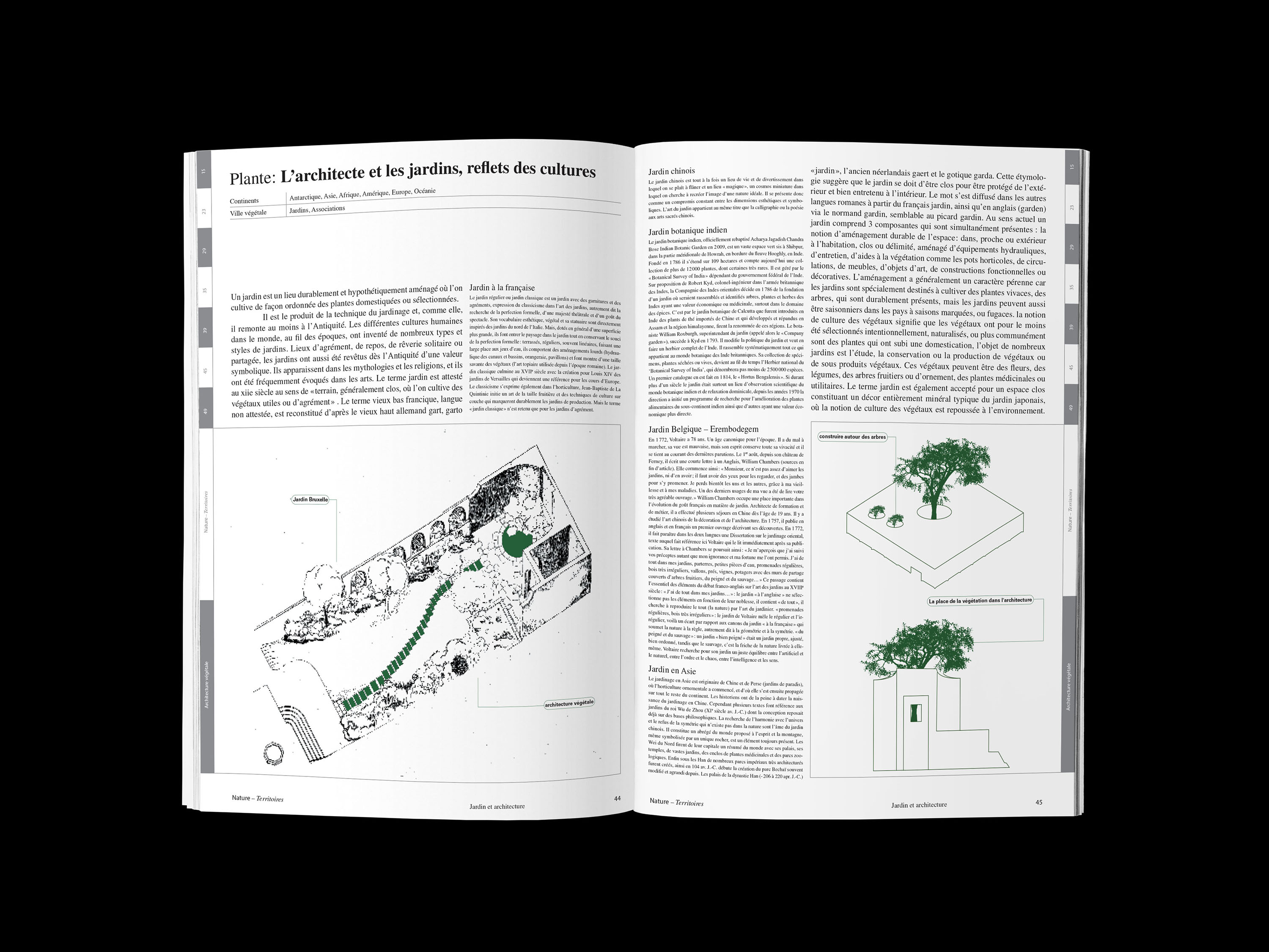 La végétation et son rôle dans notre quotidien sont les thèmes abordés dans mon ouvrage. J’ai ancré mon travail de diplôme autour d’éléments historiques (planches, estampes), de représentations visuelles et d’explications scientifiques. Mes recherches m’ont fait prendre conscience que la végétation est utilisée aussi bien dans nos médicaments que dans notre manière de vivre.